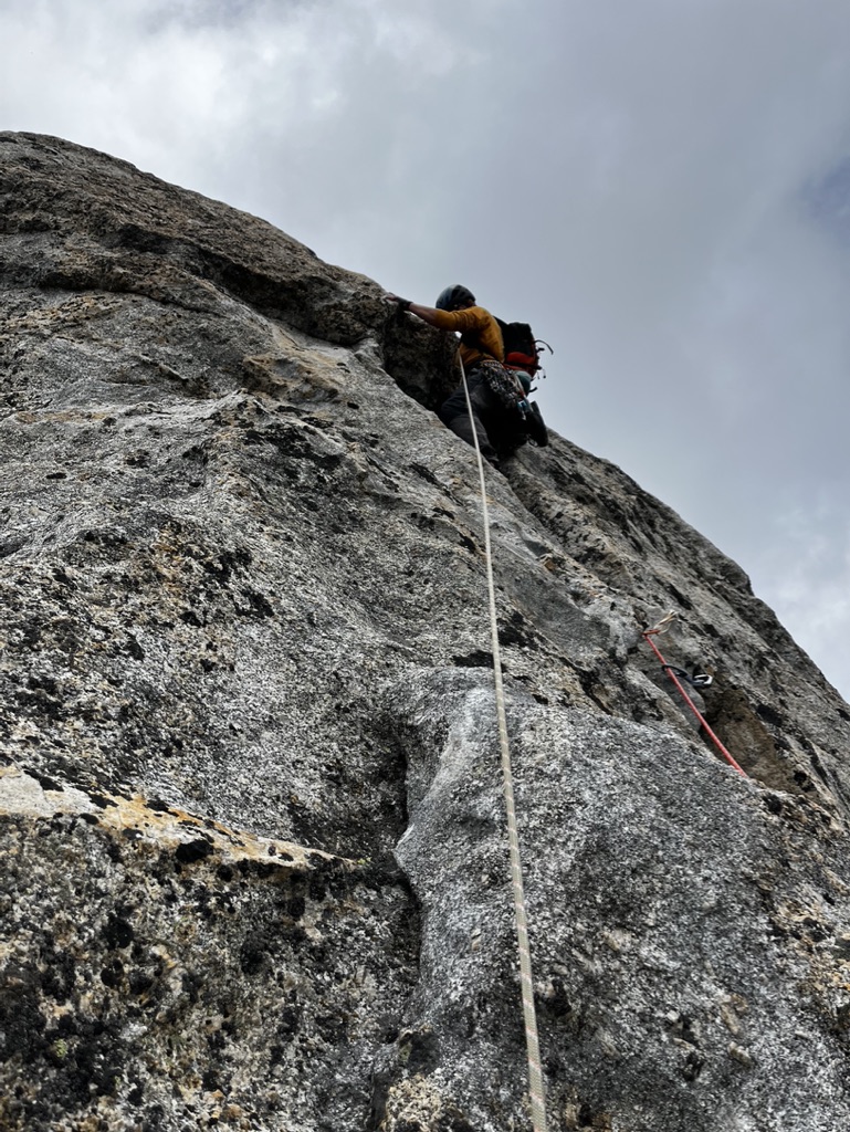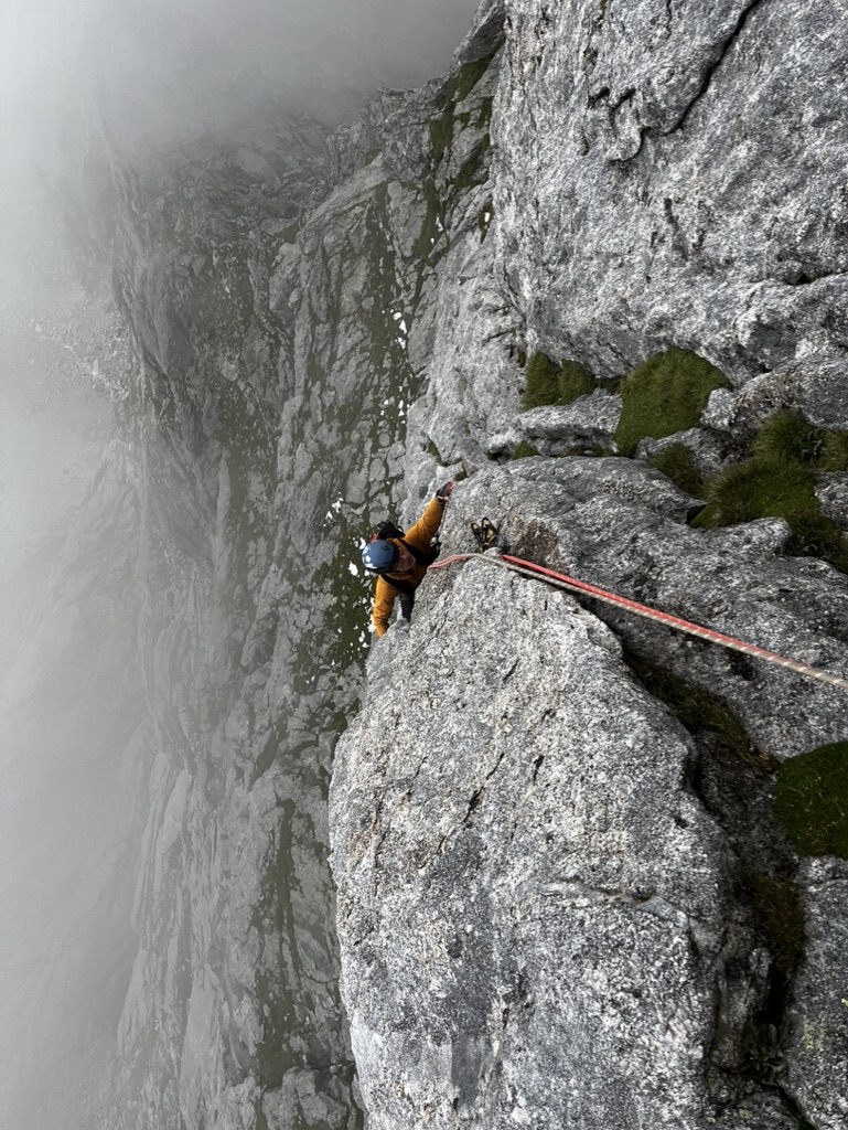 As we reached the system of ledges that led to the start of the route – we roped up, hoping to be able to use spikes to safeguard ourselves as we scrambled along the loose terrain. This proved to be a poor decision. There were not enough spikes, or gear, to provide ourselves with a reasonable degree of security, and it only added faff and risk. The approach was not particularly easy: the topo in the Solo Granito guide was quite rubbish, and the route finding not particularly intuitive. Eventually, we reached the start of the route. We accidentally simul-climbed half the first pitch, not realising the route had started proper, quickly set up a belay around a big spike, and continued to the first proper belay- two pegs.