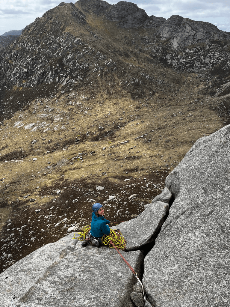Two pitches of easy cracks (around VS) lead to terrace, where the route finishes and you walk off. I was absolutely freezing at this point: we’d only taken one belay jacket between us and Lara had been wearing it, so I swiftly put on both our waterproofs and all our other spare clothes and we walked down.