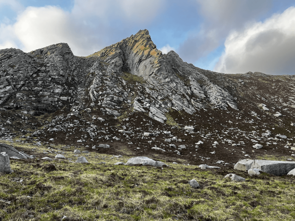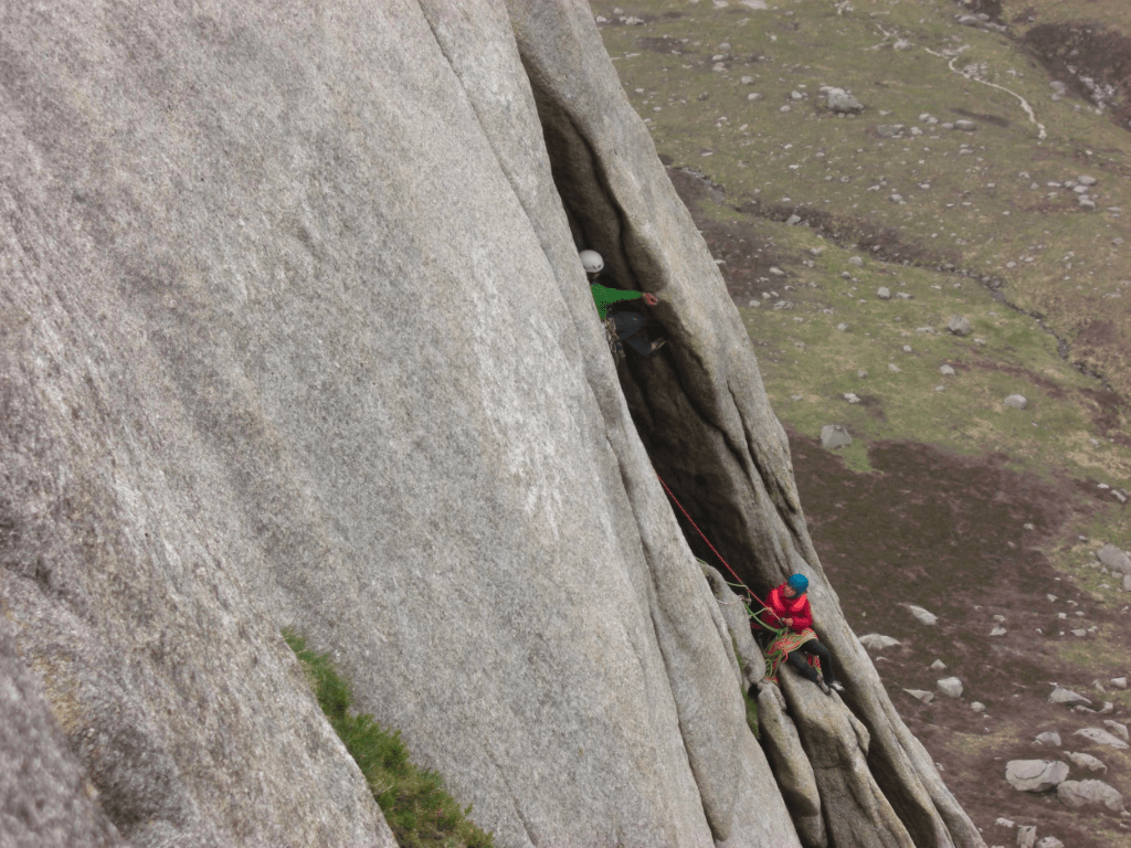 You follow the corner crack up to a juggy band of granitic mushrooms, before making a bold traverse along these to reach a large ledge, where this route joins Sou’wester slabs. You can also carry on up the corner at tech 5c.