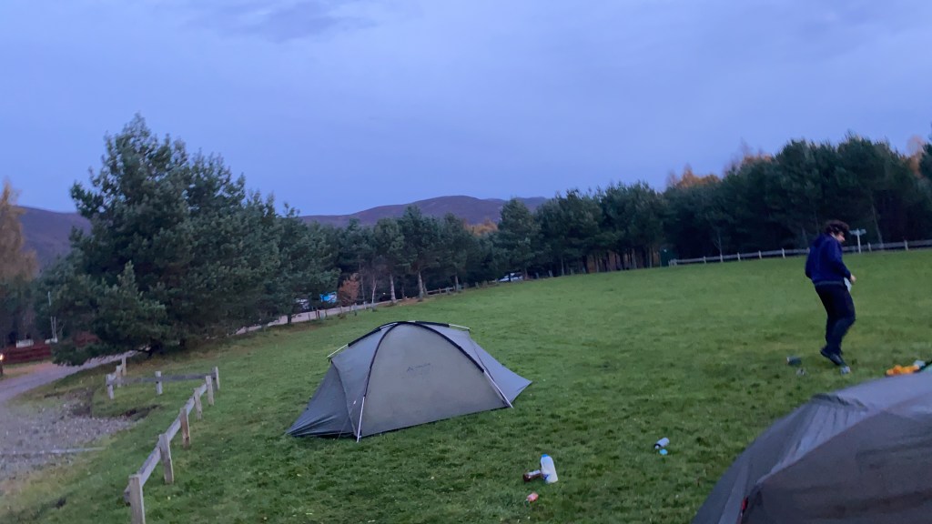 Opting to avoid the extortionate cost of youth hostels, campsites, and hotels, we set up our tent in a bush in a secluded corner of Aviemore, just above the A9. Despite the pine forest, we were pitched in, the road noise somewhat damped the ambience of the forest. After watching a movie, we set our alarms early and went to bed.