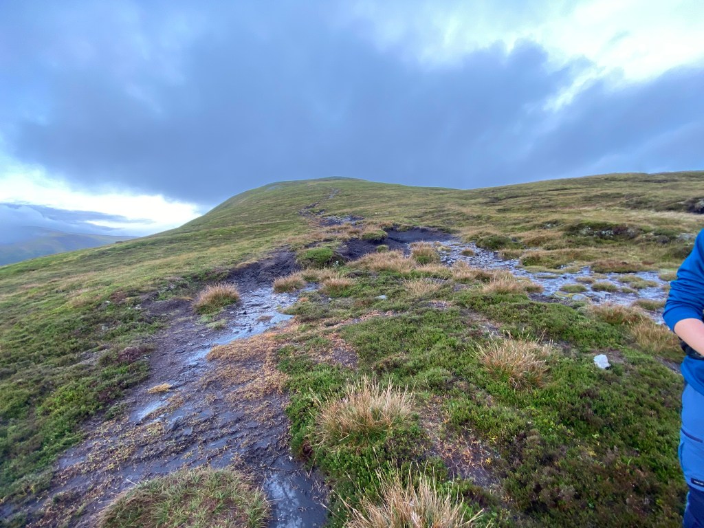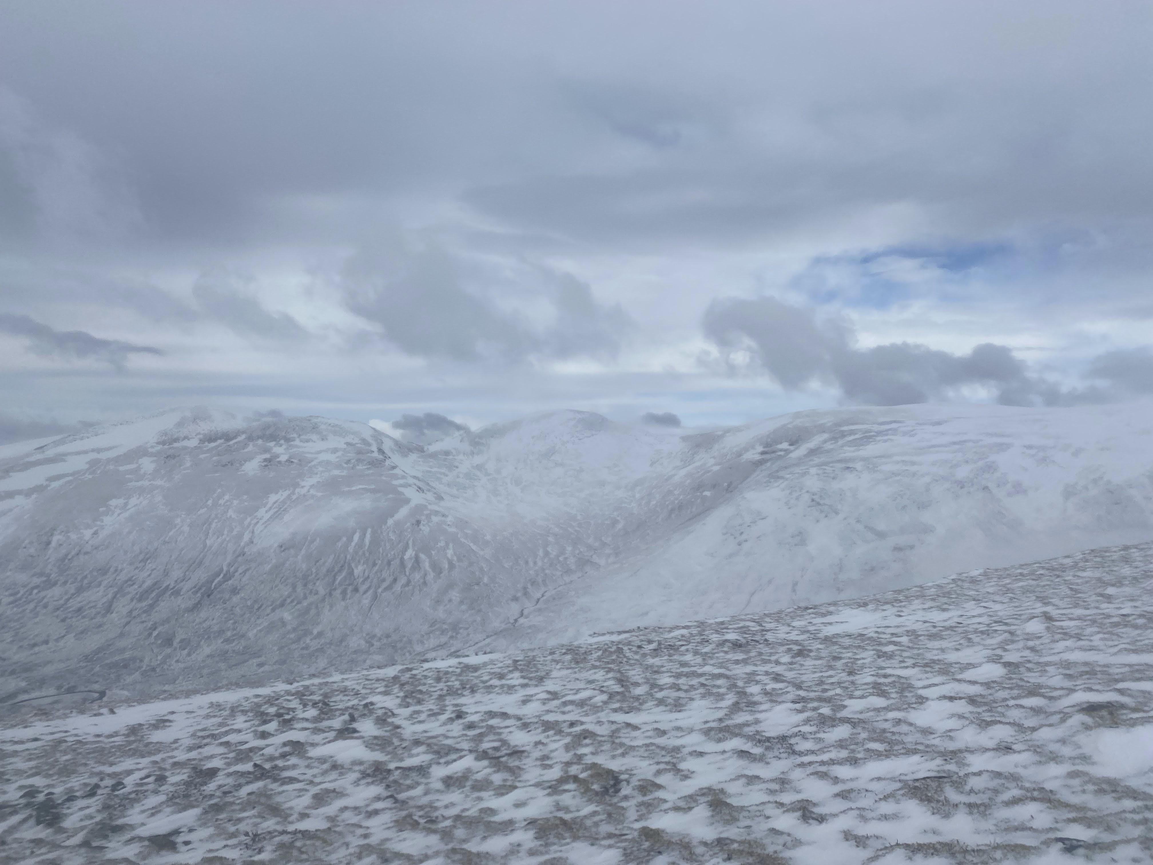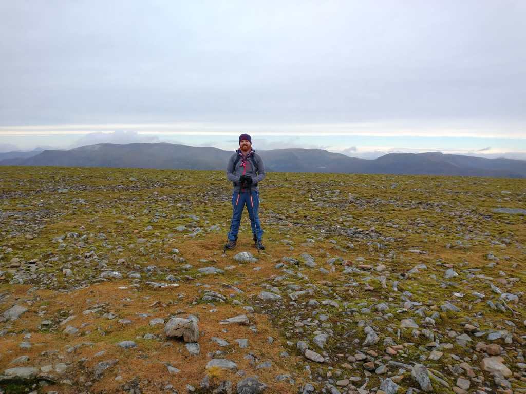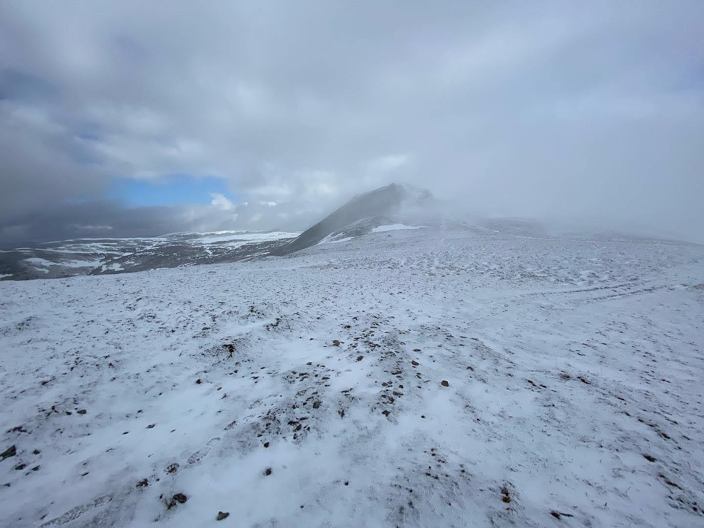 From the saddle, a path rose gently to the next Munro, the gradient being steep enough to warm us up after the brief water stop, but remaining far more comfortable than the eye-watering steep climbs that are the norm in the North West highlands. This leads to a broad ridge, with the summit of A’Mharconaich at 975m. From here, a gentle ridge led us along for around 4km to the summit of our third Munro, Beinn Udlamain at 1011m. The fog cleared as we were at the top, opening up a beautiful view into the Ben Alder Forest and across the rest of the Cairngorms