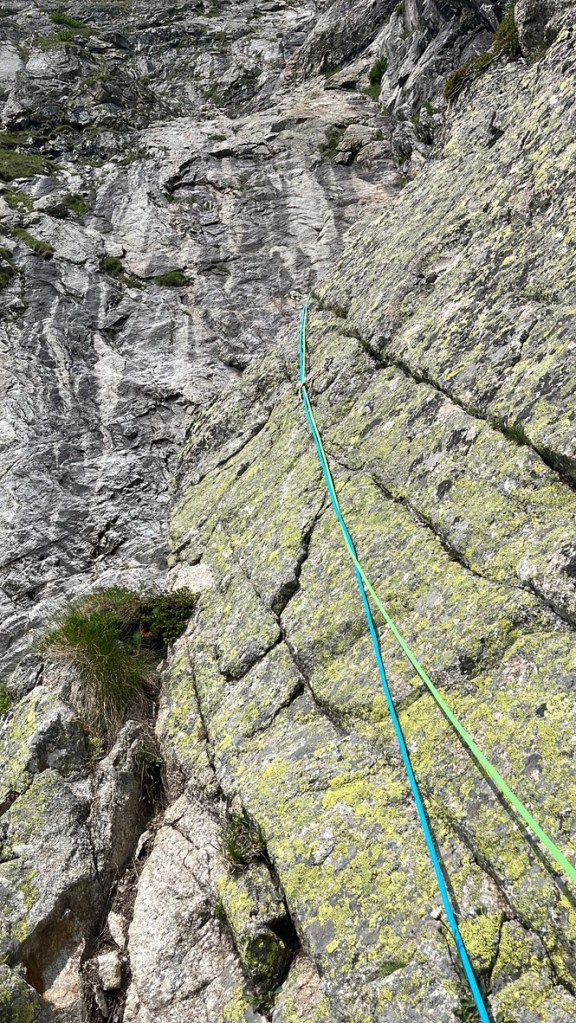 As we reached the system of ledges that led to the start of the route – we roped up, hoping to be able to use spikes to safeguard ourselves as we scrambled along the loose terrain. This proved to be a poor decision. There were not enough spikes, or gear, to provide ourselves with a reasonable degree of security, and it only added faff and risk. The approach was not particularly easy: the topo in the Solo Granito guide was quite rubbish, and the route finding not particularly intuitive. Eventually, we reached the start of the route. We accidentally simul-climbed half the first pitch, not realising the route had started proper, quickly set up a belay around a big spike, and continued to the first proper belay- two pegs.