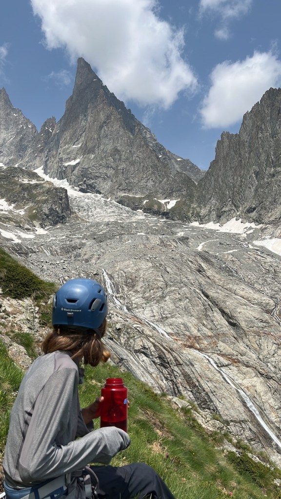 Two pitches of easy cracks (around VS) lead to terrace, where the route finishes and you walk off. I was absolutely freezing at this point: we’d only taken one belay jacket between us and Lara had been wearing it, so I swiftly put on both our waterproofs and all our other spare clothes and we walked down.